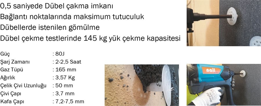 Nail GSN 40 D gazlı mantolama dübeli tabancası,Dış cephe kaplamaları,Beton tuğla ve Duvar yalıtım levhalarının tespitinde,Hızlı,Ekonomik ve Sağlam uygulamalar için idealdir.